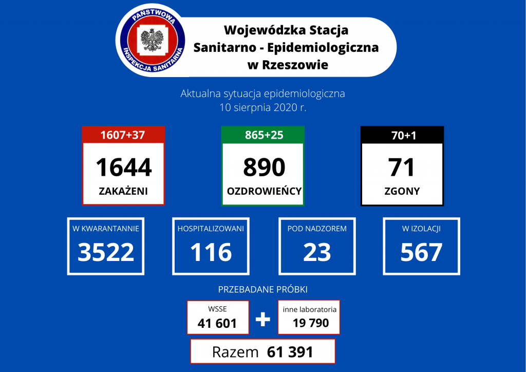 Wedle najnowszych danych Ministerstwa Zdrowia w całym kraju koronawirusa potwierdzono u 52 410 osób, z których 1 809 zmarło. Na Podkarpaciu zaraziło się 1 644 osób: 890 wyzdrowiało, a 71 odeszło. Pod nadzorem znajduje się 23 osób, 3 522 poddano kwarantannie, w izolacji jest 567.