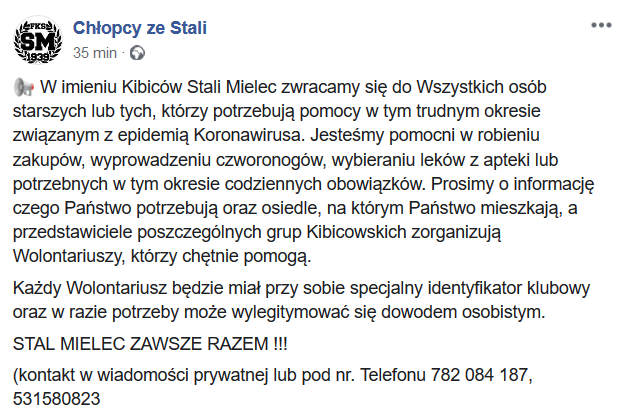 „W imieniu kibiców Stali Mielec zwracamy się do wszystkich osób starszych lub tych, którzy potrzebują pomocy w tym trudnym okresie związanym z epidemią koronawirusa. Jesteśmy pomocni w robieniu zakupów, wyprowadzeniu czworonogów, wybieraniu leków z apteki lub potrzebnych w tym okresie codziennych obowiązków. Prosimy o informację czego Państwo potrzebują oraz osiedle, na którym Państwo mieszkają, a przedstawiciele poszczególnych grup kibicowskich zorganizują pomoc.