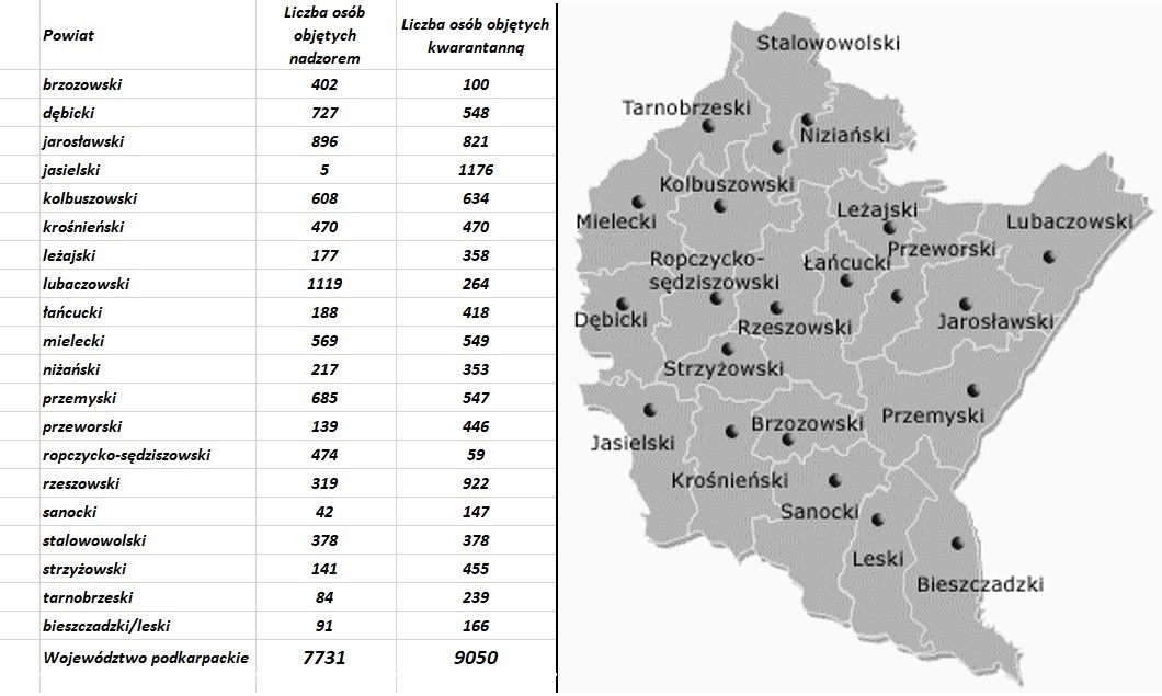 Ogółem na terenie Podkarpacia pod nadzorem pozostaje 7731 osób, a 9050 poddane jest kwarantannie. W szpitalach przebywa 65 mieszkańców. Od początku wdrożenia badań w kierunku koronawirusa w laboratorium Wojewódzkiej Stacji Sanitarno-Epidemiologicznej wykonano 1492 testów.