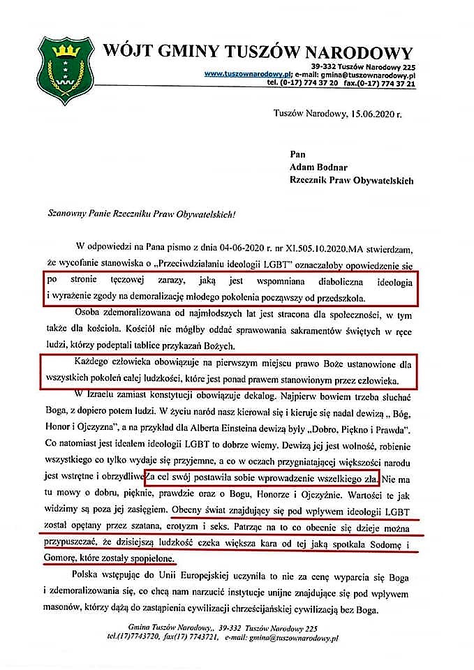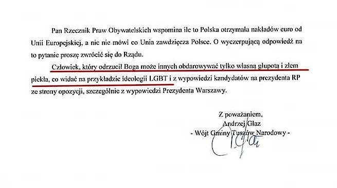 Osoba, która odrzucił Boga może innych obdarowywać tylko własną głupotą i złem piekła, co widać na przykładzie ideologii LGBT – podkreśla w swym liście gospodarz gminy Tuszów Narodowy.