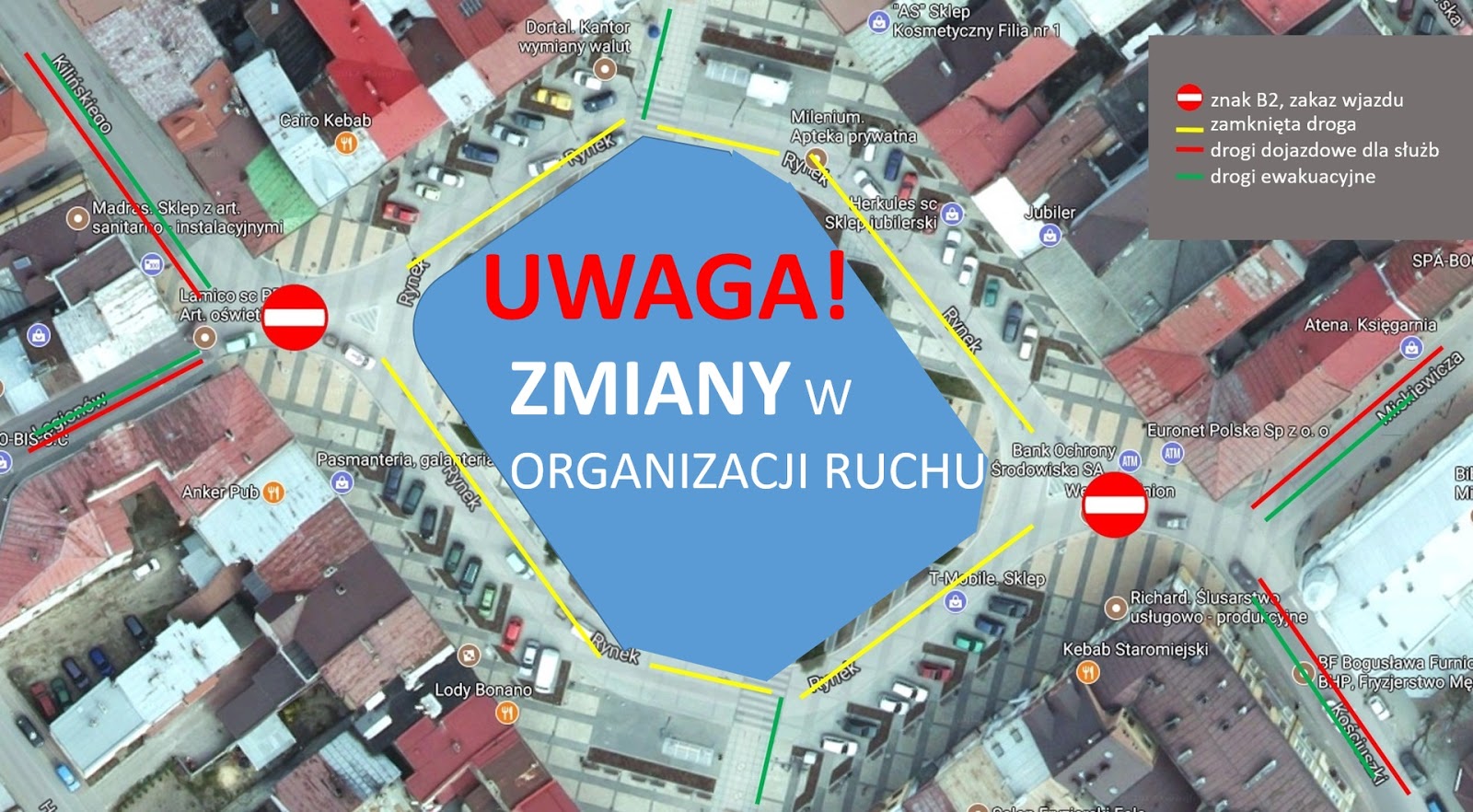 Wyłączona z ruchu będzie ulica Rynek. Dotknie to też styk ulic: Mickiewicza i Kościuszki oraz Legionów i Kilińskiego. Ograniczenia te obowiązywać będą od soboty (godz. 14) do poniedziałku (godz. 7).
